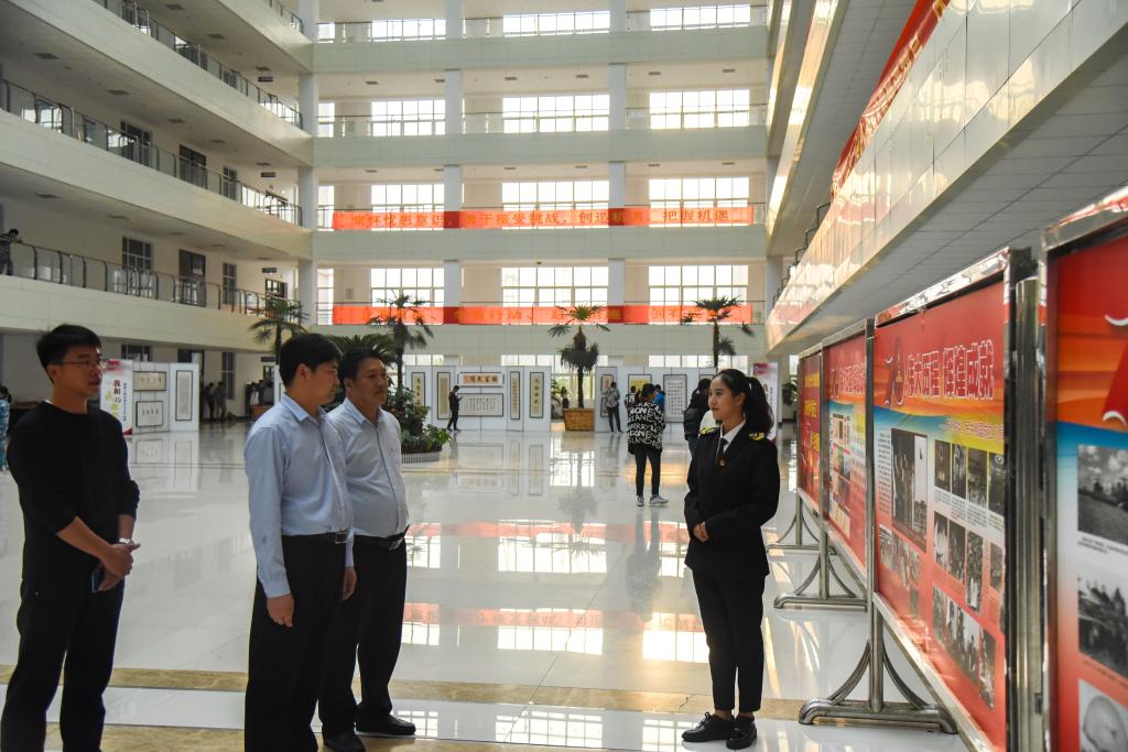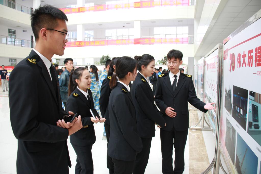 活动开始,讲解员带领着学校领导及同学们在A0阳光大厅进行浏览,一幅幅图片活灵活现的展示了祖国70周年日新月异的发展变化,让大家领略了祖国的大好河山。其次,讲解员认真讲解了山东港口在此期间的经历以及取得的辉煌成就,使同学们深入的了解了山东港口。最后,刘丽希望同学们能够从中发现道理,树立好目标,并向着目标不断前进。