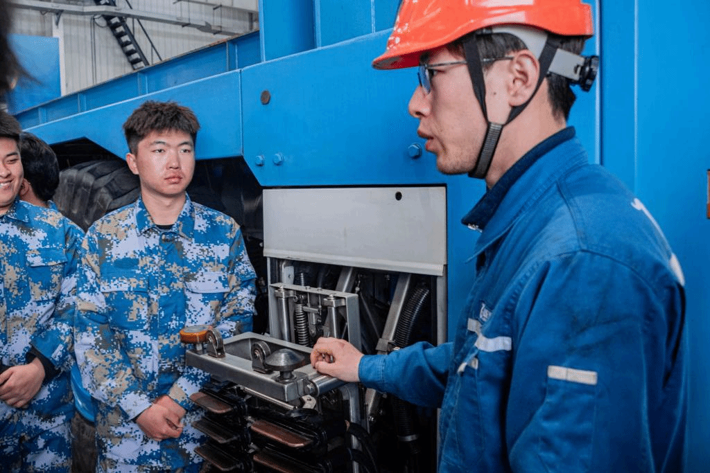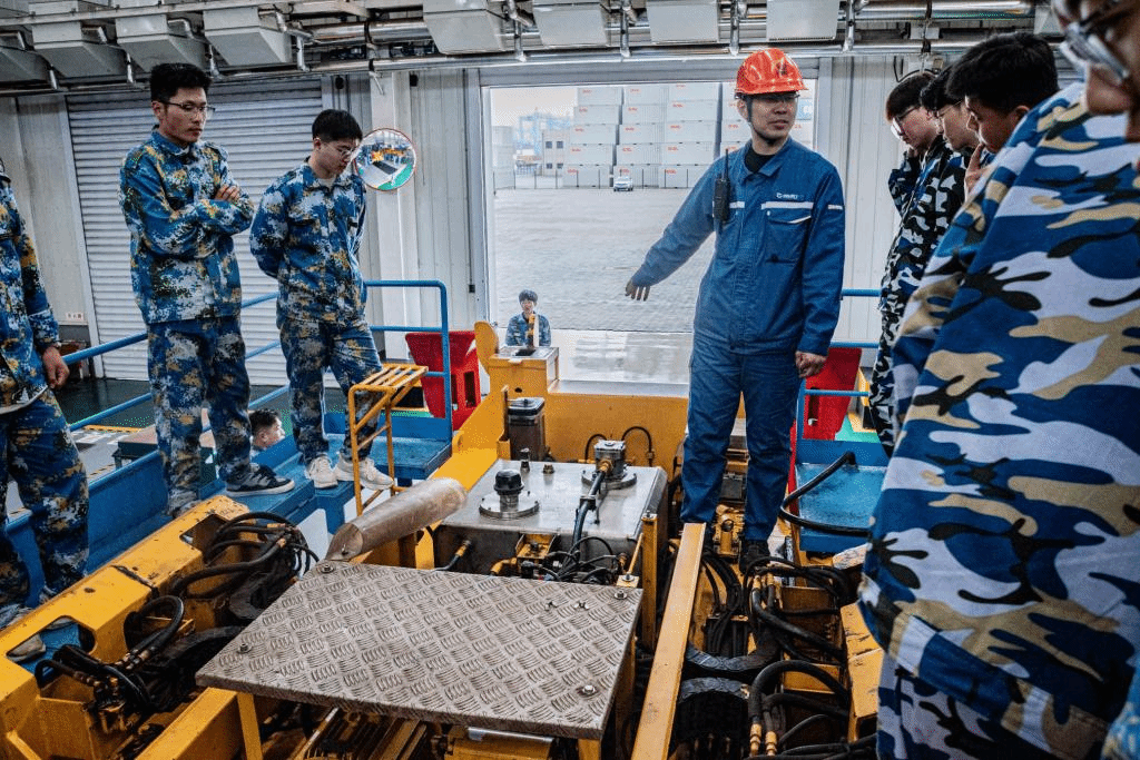 在山东港口青创基地,共青团十九届中央委员会候补委员张常江利用自动化集装箱码头模拟沙盘向同学们讲解了青岛港的“硬核实力”以及自动化码头青年科技团队的优秀典型,为同学们上了一节精彩的现场思政课。在自动导引车(AGV)和集装箱吊具维修车间,产业教授、全国青年岗位能手朱林和现场技术能手讲解了AGV设备、集装箱吊具的结构、工作原理及日常维保,并组织了实操训练。通过学习,学生们深入体会观察青岛港自动化码头发展脉络并走近自动化码头建设的创新前沿,了解掌握智慧港口相关设备的维保知识,现场感受青岛港践行科技自立自强、爱国奋进的使命担当。学生们纷纷表示要在学习实践中不断汲取精神力量,牢记使命担当,立志成为敢闯敢试、严谨踏实的新青年。