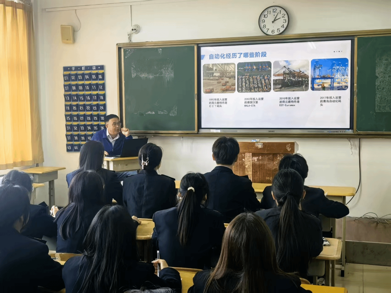 讲座中,张卫以全球首个自动化码头诞生为切入点,系统梳理港口技术从机械化、数字化到智能化的三大发展阶段。他通过青岛港全自动化码头、荷兰鹿特丹港等典型案例,以“解集装箱卡锁”的生动比喻,揭示智能化进程中设备接口标准化与作业流程规范化的重要性,引发学员对技术创新与行业协同的深入思考。学员仲国庆表示:“作为振超精神的传承者,我们要以行业楷模为榜样,深耕专业领域,为港口事业发展贡献青春力量。”此次讲座是振超工匠班人才培养体系的重要组成部分,通过行业专家深度剖析、校企导师经验分享等形式,为学员带来一场场干货满满的知识盛宴。