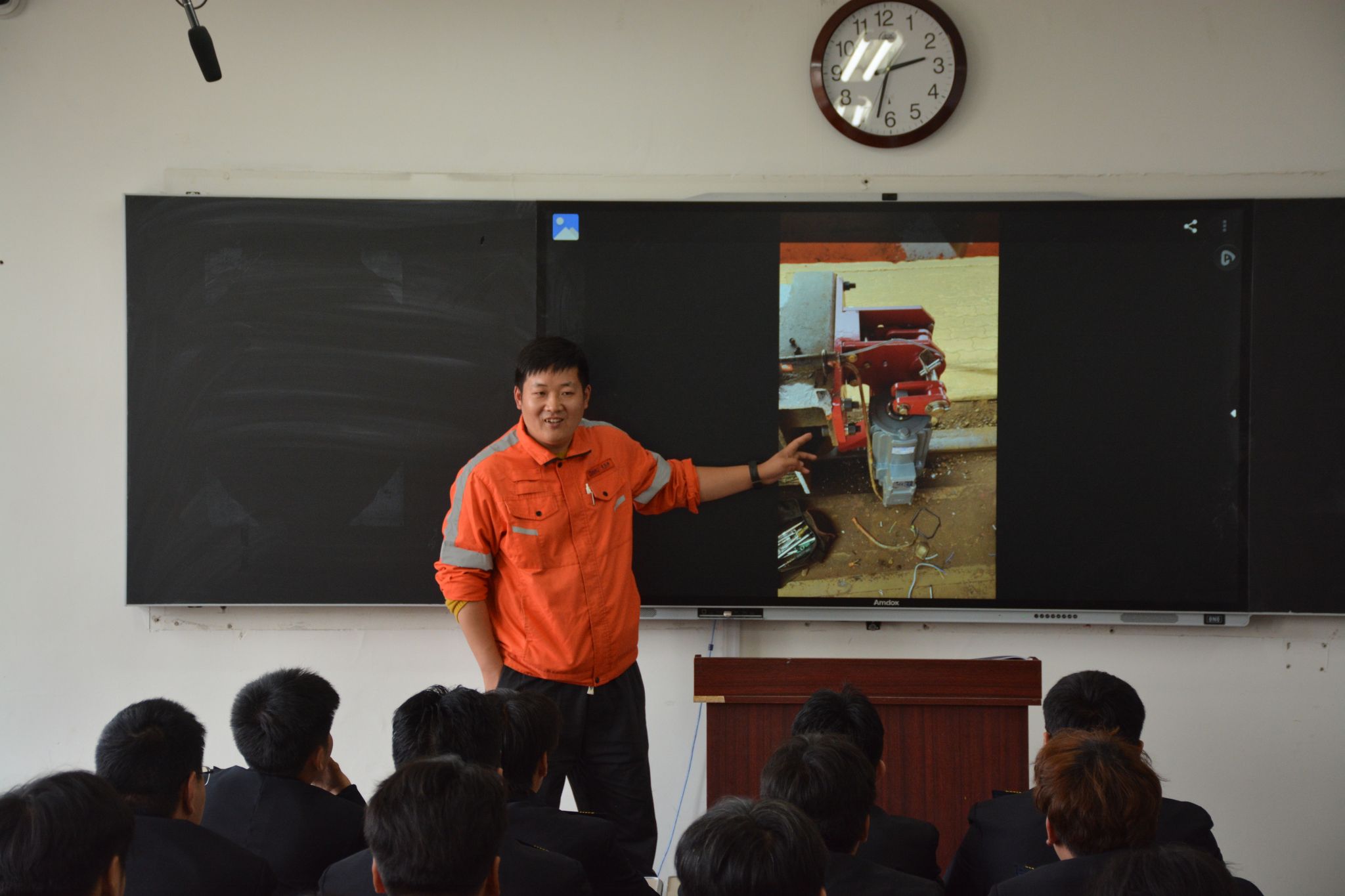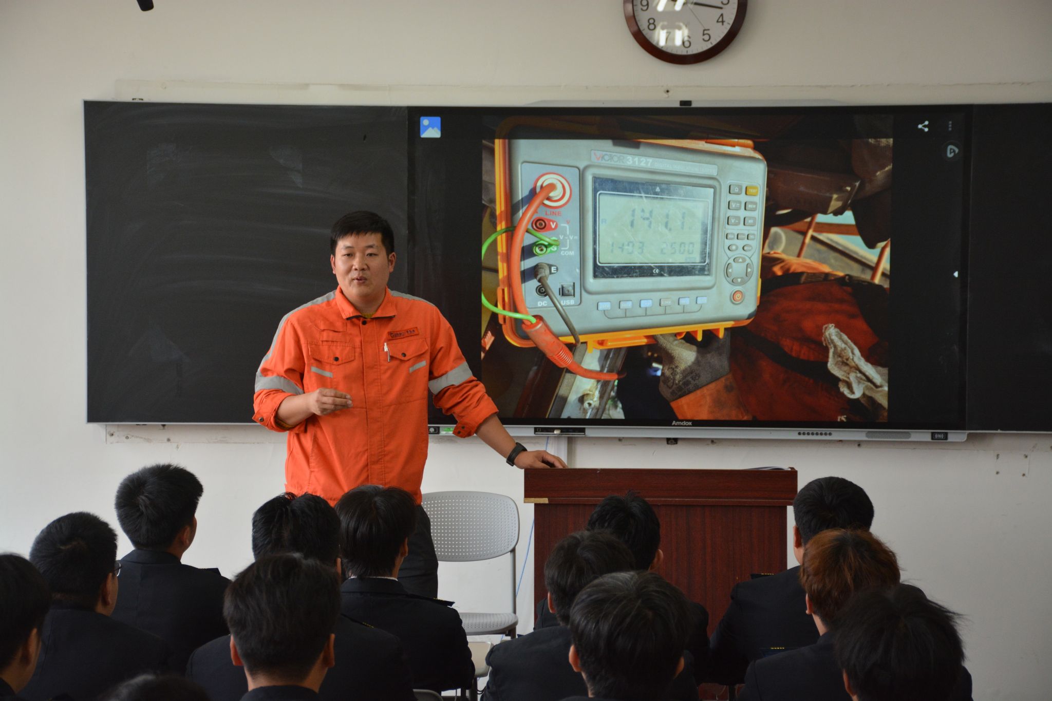 讲座伊始,刘希村首先介绍了李超的基本情况和专业成就。随后,李超结合自身在董家口矿石码头数年的电气运维与管理经验,以“智慧港口电气系统的创新实践”为主题,围绕码头供配电架构、自动化装卸设备电气控制、故障快速诊断与智能运维三个方面展开讲解。他重点剖析了大型皮带机、堆取料机等核心设备的电气改造案例,分享了通过PLC程序优化与变频调速技术实现节能降耗的实战经验,并鼓励同学们树立“问题即课题、现场即课堂”的工程思维。李超强调,智慧港口的发展日新月异,电气技术人才要始终保持学习热情与钻研精神,希望两个班级的同学珍惜在校学习机会,主动对接行业标准,在实践中不断提升技术应用与故障处置能力。讲座最后,学生们围绕自动化码头电气系统冗余设计、新能源在港口的应用前景等问题踊跃提问,李超逐一解答,并现场演示了某型电控柜的故障排查流程。