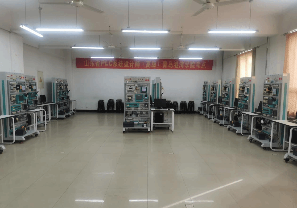 PLC实训室有20套三菱一体化PLC实训台及配套编程电脑,实训台设备主要包括三菱FX5U PLC、E840网络型变频器、JE-10C网络型伺服驱动系统、昆仑通泰触摸屏、直流电动推杆、传感器、低压电器和笼型电机等。实训室能够开展继电器控制实训、PLC编程调试实训、变频器实训、触摸屏实训、各种总线通信实训等实训项目。