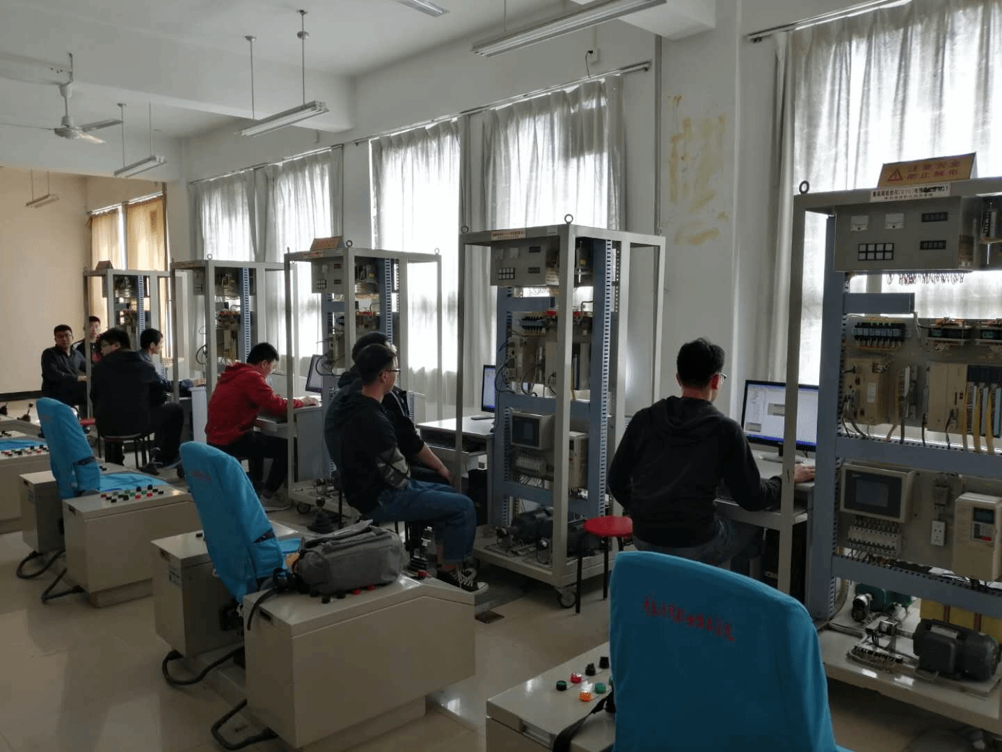 港口电气控制实训室有5套集装箱轮胎吊电控模拟器和61台电脑,集装箱轮胎吊电控模拟器由目前国内大多数港口正在使用的安川CP316H PLC、G7变频器、触摸屏、三相异步电机、编码器、辅助电控设备和联动操作台组成,配备模拟现场故障箱。实训室可以开展轮胎吊电气控制系统电气识图、安川PLC编程上传、下载、变频器参数设定、调试,轮胎吊故障查找排除等实训项目。